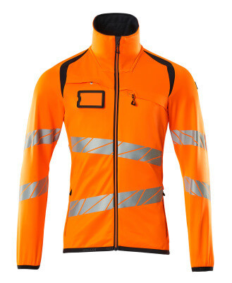 Fluorescent with oblique, transverse reflective strips. Modern, close fit with great freedom of movement. High collar. Two-toned. Fastening with zip and internal storm flap. Chest pocket with a zip. Front pockets with a zip. Inner pockets. Elastic at cuffs and waist. Detachable ID card holder.