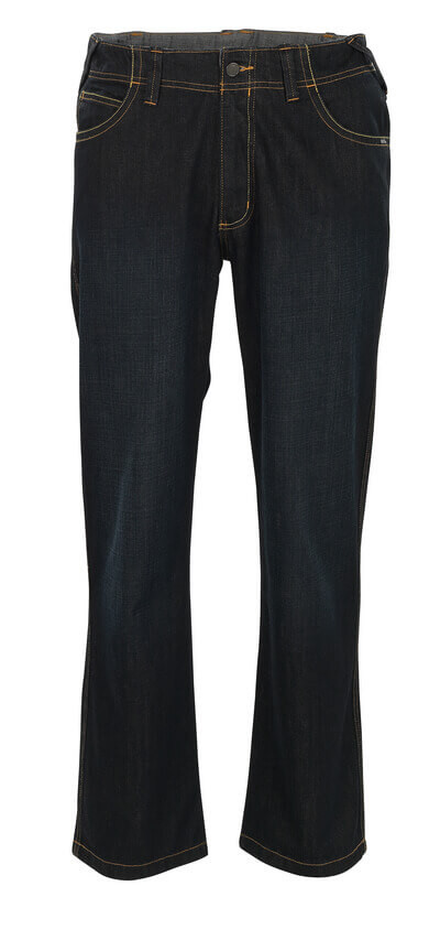 Double stitched seams on the leg and crotch. Low waist and form cut waist band. Belt loops. Fly with zip. Front pockets. Coin pocket. Back pockets. Orange and yellow contrast stitching.